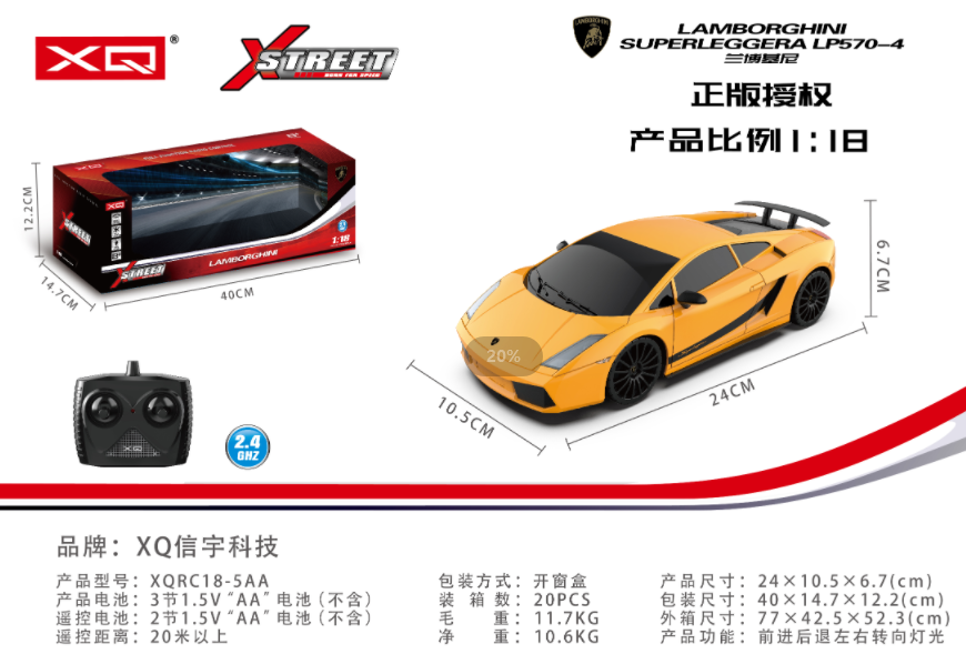 | 型号 | XQRC18-5AA | 品名 | 1:18兰博基尼超跑 LP570-4 (黄色) |
