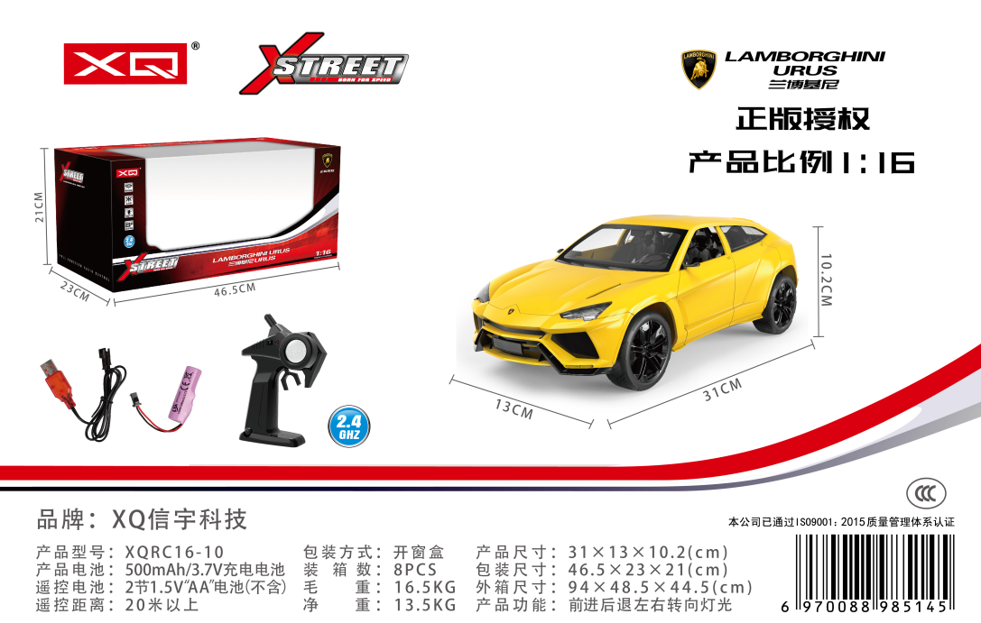 | 型号 | XQRC16-10 | 品名 | 1:16兰博基尼 Urus 黄色(正版授权) |